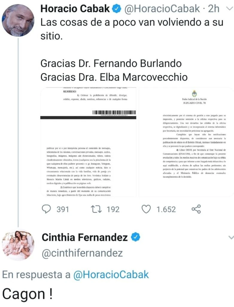 La noticia fue dada por Horacio en su cuenta de Twitter, en donde además de publicar las imágenes del escrito les agradeció a sus letrados: “Las cosas de a poco van volviendo a su sitio. Gracias Dr. Fernando Burlando, gracias Dra. Elba Marcovecchio”.