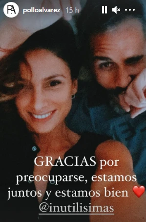 Después de las declaraciones del Pollo Álvarez, el propio conductor dio por finalizado los rumores de crisis con una contundente foto íntima: "Gracias por preocuparse, estamos juntos y bien", escribió junto a un emoji de corazón. Tefi, por su parte, se hizo eco del mensaje y compartió la selfie también en su cuenta.