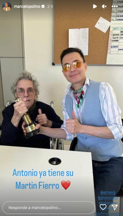 "Antonio ya tiene su Martín Fierro", destacó Marcelo en la historia de Instagram que subió. Por primera vez en mucho tiempo, el histórico capocómico que trabajó junto a Susana apareció publicamente en medio de sus problemas de salud.