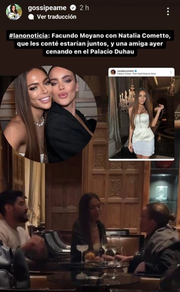 "Facundo Moyano con Natalia Cometto, les conté que estarían juntos, y una amiga ayer cenando en el Palacio Duhau. Él es medio sinvergüenza, tienen varios amigos en común y, es feo lo que voy a decir, pero estas chicas con las que frecuenta salen de una especie de grupo de modelos que buscan instalarse", contó.