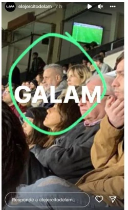 La escena remite a un estadio de fútbol, más precisamente a la platea del Monumental, donde Rial se encuentra en un lenguaje de complicidad con esta dama. "Galam", le escribieron en la storie del show de Ángel, como una especie de juego de palabras con galán.