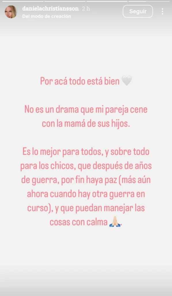 Mientras tanto, Daniela Christiansson, pareja de Maxi, intentó bajarle el tono a la situación y dijo: “Por acá todo está bien. No es un drama que mi pareja cene con la mamá de sus hijos. Es lo mejor para todos, y sobre todo para los chicos, que después de tantos años de guerra haya paz, y que puedan manejar las cosas con calma”.
