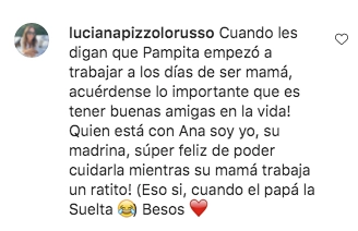 Luciana no anduvo con rodeos y explicó en redes, para desactivar la controversia, por qué tomó esa responsabilidad: "Cuando les digan que Pampita empezó a trabajar a los días de ser mamá, acuérdense lo importante que es tener buenas amigas en la vida”.