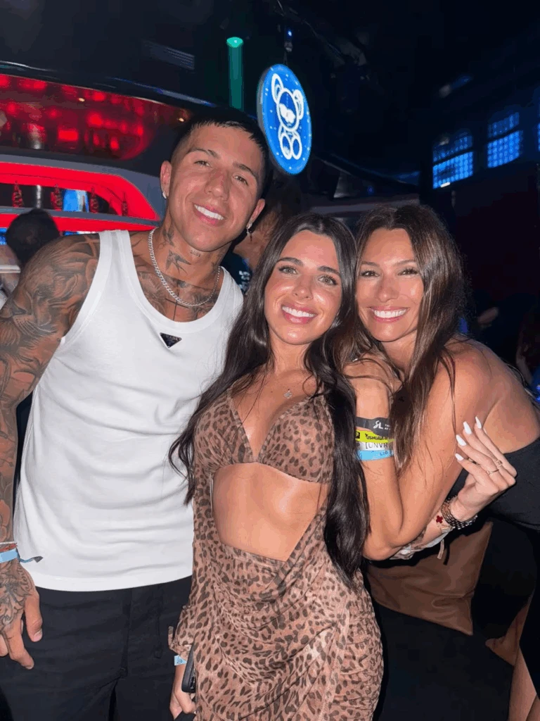La noche ibicenca también fue parte de la escapada. Pampita lució un vestido negro ajustado y bailó rodeada de figuras como Zaira Nara, Nicolás Furtado, y los Montaner. Enzo y Valentina se sumaron a esa salida, en la que quedaron registrados en la misma foto con la conductora.