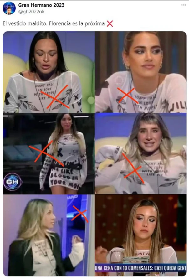 Flor lució en una de las galas, al igual que el resto de las chicas de GH, un vestido que en las redes dicen que porta una maldición, porque tanto Agostina, Sabrina, Catalina, Paloma y Zoe se lo pusieron alguna vez. “El vestido maldito. Florencia es la próxima”, sentenciaron en Twitter, al mostrar a la modelo.