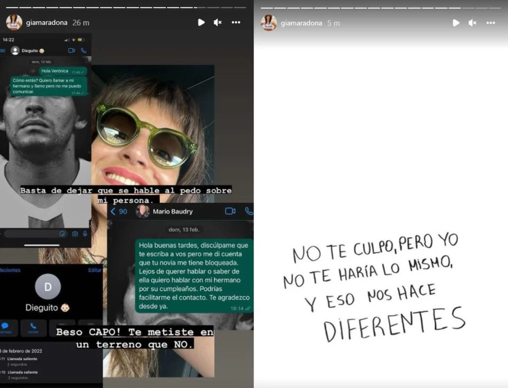 "Hola Verónica. Cómo estás? Quiero llamar a mi hermano y llamo pero no me puedo comunicar”, se lee en el primer mensaje que Gianinna Maradona postea y se ve que el contacto de Ojeda no tiene foto ni tampoco le llegan los mensajes. Fue entonces que se dio cuenta que estaba bloqueada.