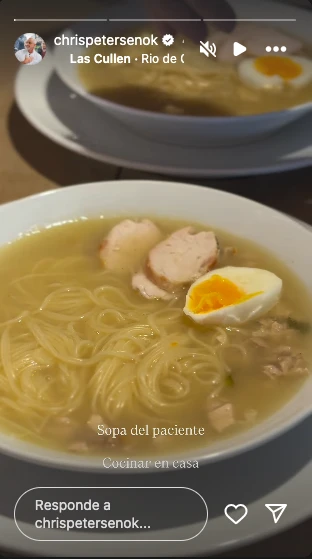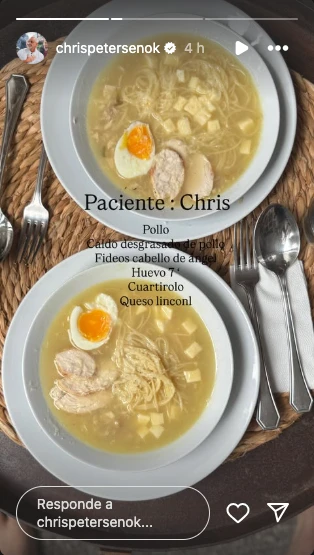 “Paciente: Cris. Pollo, caldo desgrasado de pollo, fideos cabello de ángel, huevo 7′, cuartirolo, queso lincoln”, escribió Christian en sus historias. El plato que degustó él mismo fue una sopa de pollo con fideos y huevo, a la que le sumó queso cuartirolo para completar su sabor. Y es que, en medio de la recuperación que lleva adelante, es importante estos cuidados que viene teniendo con su cuerpo.