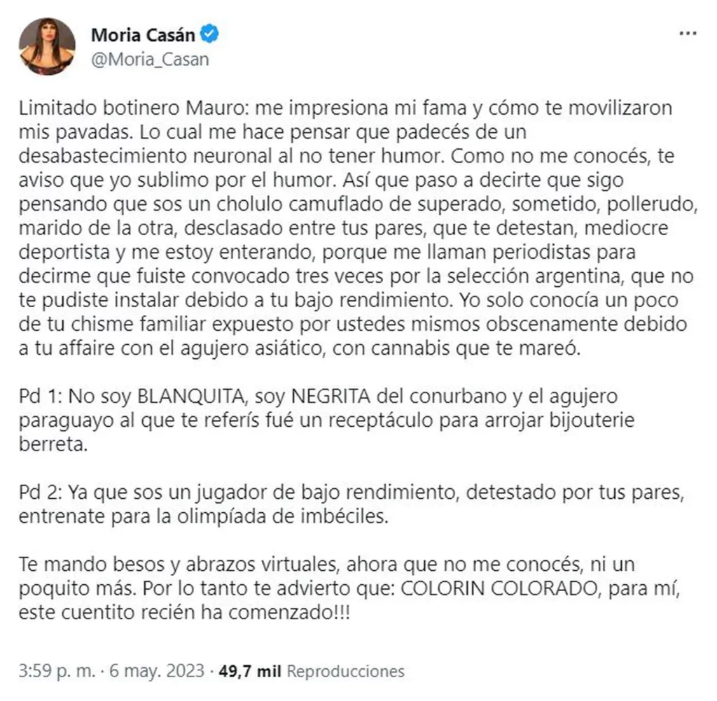 Eso no fue todo porque Moria fue por más y le respondió filosa: "Limitado botinero Mauro: me impresiona mi fama y cómo te movilizaron mis pavadas. Lo cual me hace pensar que padecés de un desabastecimiento neuronal al no tener humor. Como no me conocés, te aviso que yo sublimo por el humor".