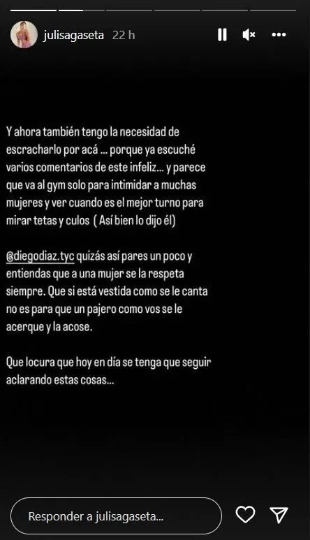 Finalmente, la joven concluyó: “Quizás así pares un poco y entiendas que a una mujer se la respeta siempre. Que si está vestida como se le canta no es para que un pa… como vos se le acerque y la acose", dejando entrever que lo único que busca es que ninguna mujer pase nuevamente por esa situación.