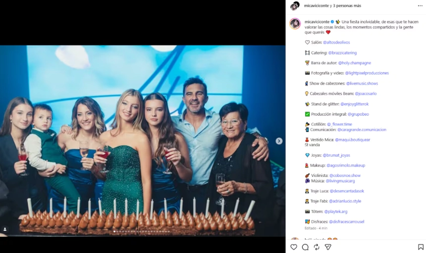 “Una fiesta inolvidable, de esas que te hacen valorar las cosas lindas, los momentos compartidos y la gente que querés”, escribió Mica en un reciente posteo en sus redes. Junto a dicha frase, compartió imágenes donde se vio parte de la intimidad de la fiesta, con postales de baile, abrazos, complicidad familiar y todo lo que se vivió puertas adentro.