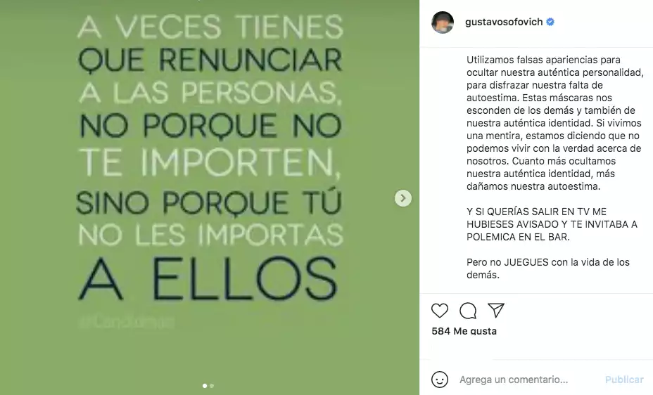 Por su parte, Gustavo solo se manifestó a través de su cuenta de Instagram en donde dejó una frase que muchos de sus seguidores relacionaron con su supuesto romance con Farjat.