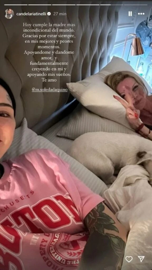 En la primera foto, Cande aparece acostada en la cama con su mamá, las dos sonriendo a la cámara. “Hoy cumple la madre más incondicional del mundo”, escribió junto a la imagen, destacando lo importante que es su mamá en su vida y cómo siempre estuvo a su lado.