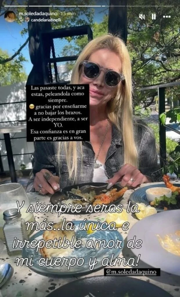 La esposa de Coti Sorokin también recordó el difícil momento que vivió Soledad hace algunos años por un problema de salud. “Las pasaste todas y acá estás, peleándola como siempre”, comentó Cande en otra foto, donde se las ve disfrutando de un almuerzo al aire libre para celebrar el cumpleaños.