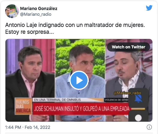 “La caradurez e hipocresía de Antonio Laje indignado analizando el video de Schulman agrediendo a una trabajadora”, posteó una internauta, en un mensaje que se repitió con un tenor similar entre muchísimos usuarios de Twitter. “Él está ahí dando clases de moral desde un medio mientras acosa pibas”, subió otro ciudadano.