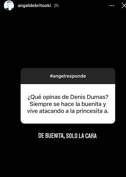 En uno de los desafíos de Instagram, que intituló #ÁngelResponde, un seguidor le puso picante y le preguntó: "¿Qué opinás de Denise Dumas? Siempre se hace la buenita y vive atacando a Karina La Princesita".