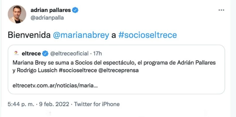 Resulta que Pallares saltó a Twitter para darle la bienvenida al ciclo Socios del espectáculo, que eltrece emitirá a las mañanas, a Mariana Brey. Sí, la angelita trabajará codo a codo con los animadores con los que LAM siempre mantuvo pie de guerra.
