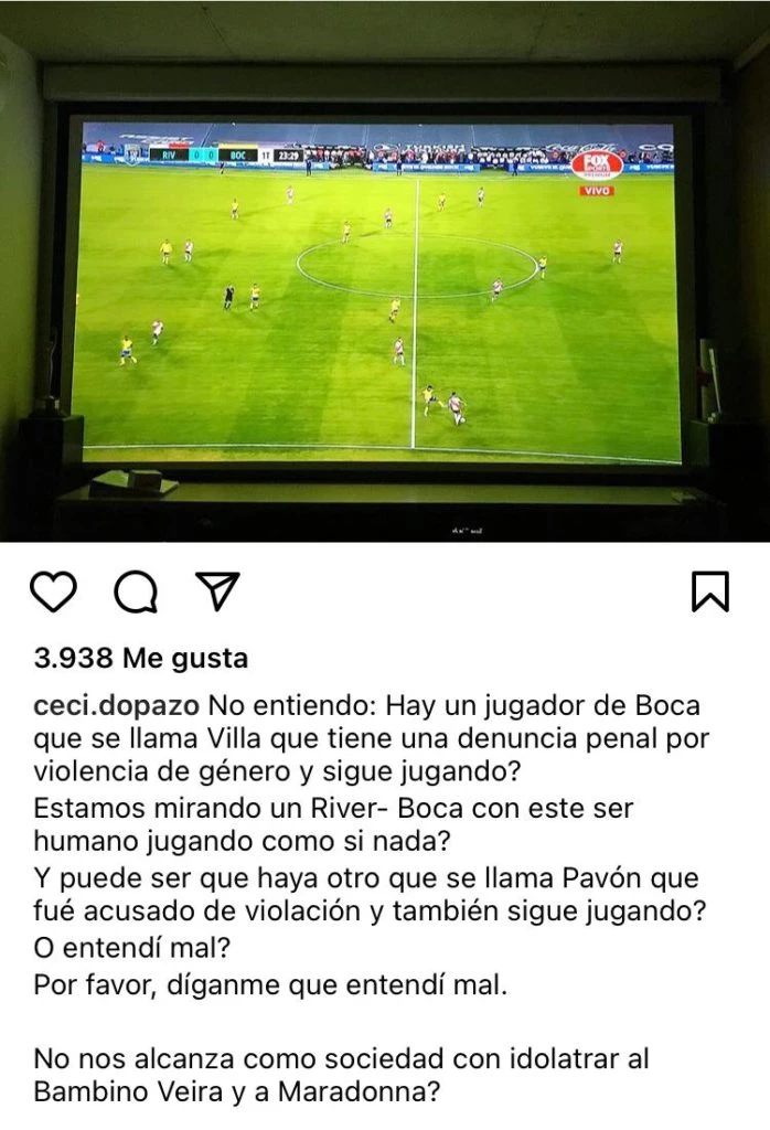 “No entiendo. ¿Hay un jugador de Boca que se llama Villa que tiene una denuncia penal por violencia de género y sigue jugando?”, cuestionó la reconocida actriz junto a una imagen de la transmisión del partido que se llevó a cabo en el Monumental. “¿Estamos mirando un River-Boca con este ser humano jugando como si nada?”, siguió indignada.