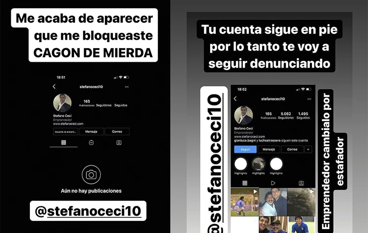 Dalma hizo un intenso descargo contra el tano a través de su cuenta oficial de Instagram, donde lo definió, entre otras cosas, de cagón, al descubrir que la había bloqueado en la red social.“Me acaba de aparecer que me bloqueaste cagón de mierda @estefanoceci10”, afirmó desde su historie la también hija de Claudia Villafañe.