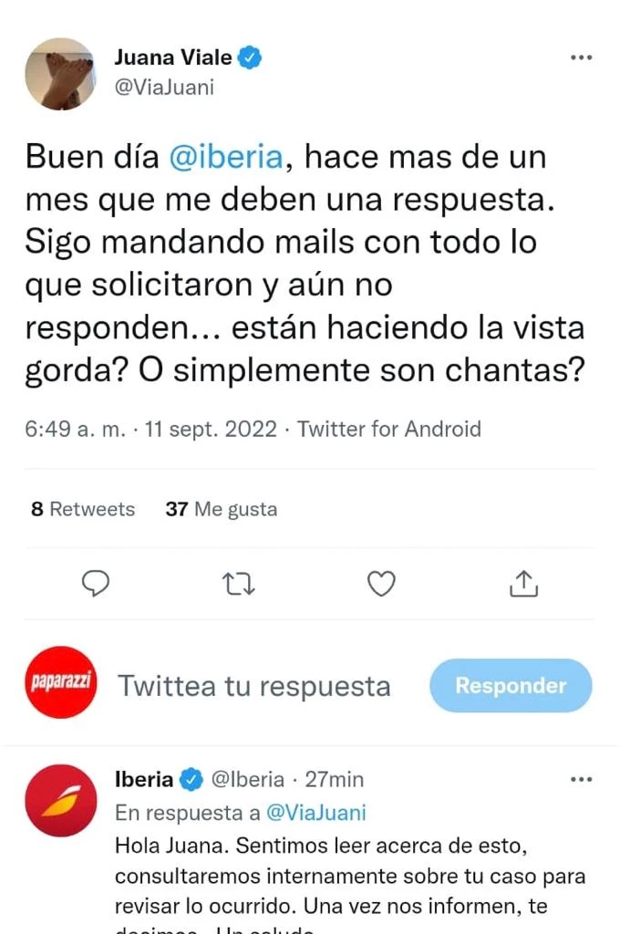 “Quiero expresar mi enojo hacia Iberia. ¡Son un desastre!”, escribió, furiosa, Juana, en un primer momento en Twitter. “Viajamos con mis hijos, además de casi no subirnos, de darnos asientos todos separados, nos perdieron una maleta, dos nos las devolvieron rotas, enviolentadas (sic) y con faltantes”, siguió.