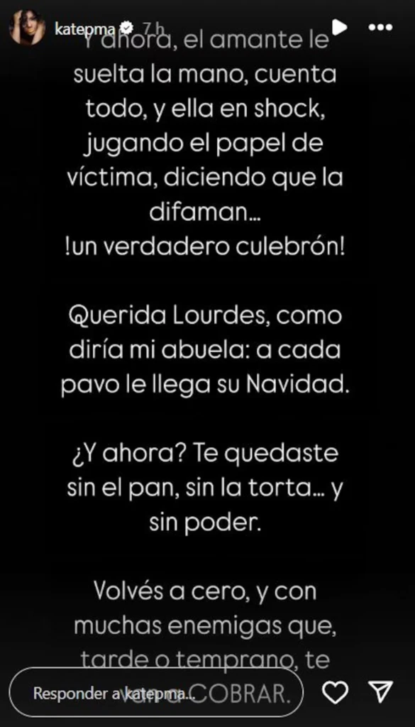 Dejó en claro que la caída de Lourdes no le generó pena, sino todo lo contrario. “Lo de Lourdes Sánchez es puro karma. Increíble la cantidad de gente (colegas) que está celebrando esta noticia, disfrutando su desliz, que por fin se le cayó la careta”, escribió Kate en una serie de explosivos posteos en sus historias de Instagram.
