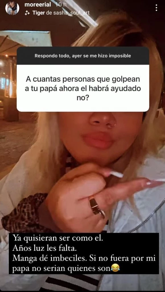 Un usuario le consultó a la influencer: "¿A cuántas personas que golpean a tu papá él habrá ayudado?". Esa simple pregunta provocó una repuesta tajante, con una foto muy descriptiva de su ira, por lo que More gritó: "Ya quisieran ser como él. Años luz les falta. Manga de imbéciles. Si no fuera por mi papá no sería quienes son".