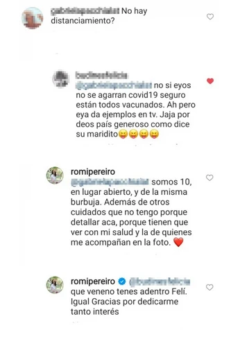 “Si ellos no se agarran Covid-19, seguro están todos vacunados. Ah, pero ella da ejemplos en TV. Ja, ja. Por Dios, ‘¡país generoso!’, como dice su maridito”, disparó la seguidora entre los comentarios de la foto. Pero Romina Pereiro no se quedó callada y le respondió furiosa.