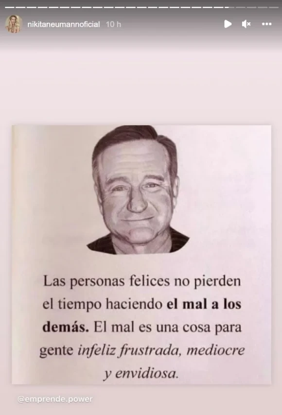 Lejos de que la pelea terminara en esta ocasión, Nicole Neumann volvió a expresarse a través de frases filosóficas en las historias de Instagram, en donde junto a la imagen del actor fallecido Robin Williams, escribió: "Las personas felices no pierden el tiempo haciendo el mal a los demás… El mal es una cosa para gente infeliz, frustrada, mediocre y envidiosa".