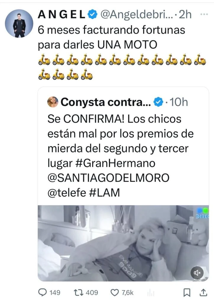 El que tomó una fuerte postura crítica una vez más fue Ángel de Brito, quien desde sus redes sociales expresó su repudio al canal de las pelotas. “6 meses facturando para darles UNA MOTO”, escribió, llenando de emojis de ciclomotores su posteo. ¡Qué escándalo!