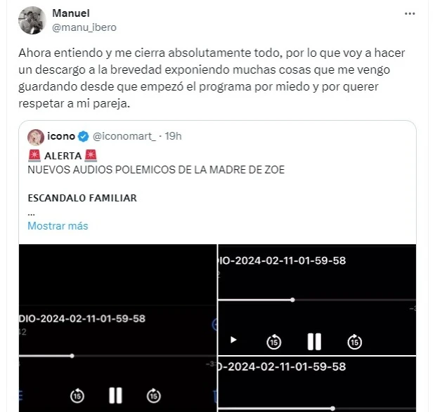 Mediante su cuenta de Twitter Manuel, el novio de Zöe, se mostró súper furioso con Aixa y dejó en claro que está cansado de las acusaciones que recibe. Fue entonces que decidió confesar que la mujer no para de hostigarlo y acusarlo de cosas que nunca ocurrieron.
