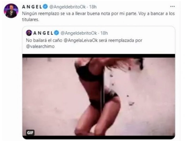 Por eso el conductor de LAM se animó a asegurar en su cuenta de Twitter que Valeria Archimó ocupará el lugar de Ángela, ya que publicó: "No bailará el caño Ángela Leiva. Será reemplazada. Ningún reemplazo se va a llevar buena nota por mi parte. Voy a bancar a los titulares”.