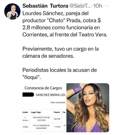 A partir de un tuit que publicó el periodista Sebastián Turtora, se iluminó un dato muy privado respecto al salario que percibiría Lourdes. Este comunicador posteó: “Lourdes Sanchez, pareja del productor Chato Prada, cobra 2.8 millones de pesos como funcionaria de Corrientes al frente del teatro Vera”.