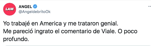 Sin embargo, De Brito acudió a su cuenta de Twitter para dar su veredicto acerca de lo que había puesto Jonatan. "Yo trabajé en América y me trataron genial. Me pareció ingrato el comentario de Viale. O poco profundo" escribió el conductor de LAM.