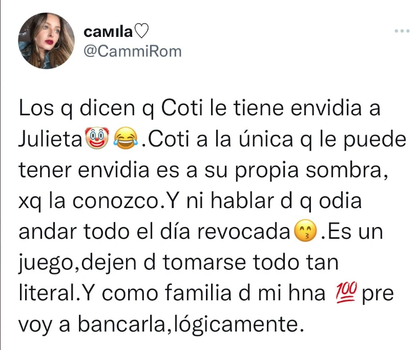 Con dos emojis, el de la cara de payaso y el de un rostro llorando de la risa, Camila tiró el primer bombazo en contra de Julieta. Lo hizo porque los usó después de la frase "los que dicen que Coti le tiene envidia a Julieta", lo que supuso una burla tanto para los que dicen eso como para la propia competidora de su hermana.