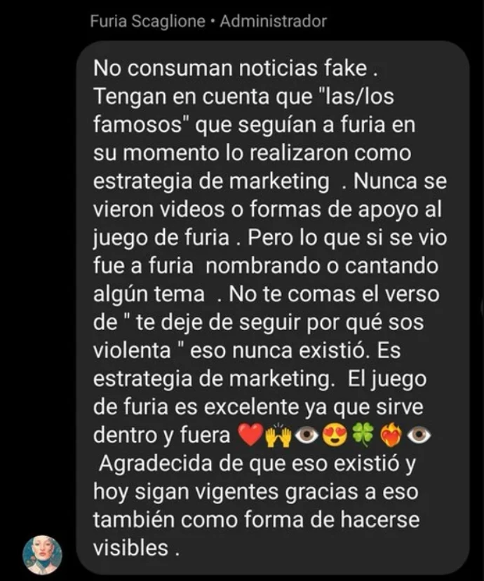 "Nunca se vieron videos o formas de apoyo al juego de Furia. Pero lo que si se vio fue a Furia nombrando o cantando algún tema. No te comas el verso de "te dejé de seguir por qué sos violenta, eso nunca existió", sostuvo en otra parte del mensaje.