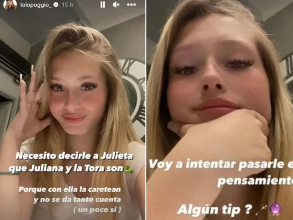“Necesito decirle a Julieta que Juliana y La Tora son víboras. Porque con ella la caretean y no se da tanto cuenta (un poco sí)”, siguió Lola, y agregó: “Voy a intentar pasarle el pensamiento, ¿algún tip?”.