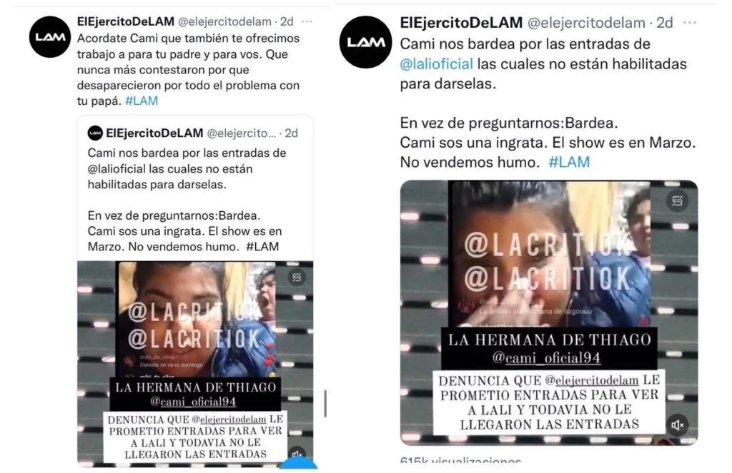Haciéndose eco de los dichos en el instagram live, desde las cuentas de El ejército de LAM salieron al cruce y enojados con la joven la trataron de desagradecida y explicaron que la entradas eran para marzo del próximo año, no para este último show.