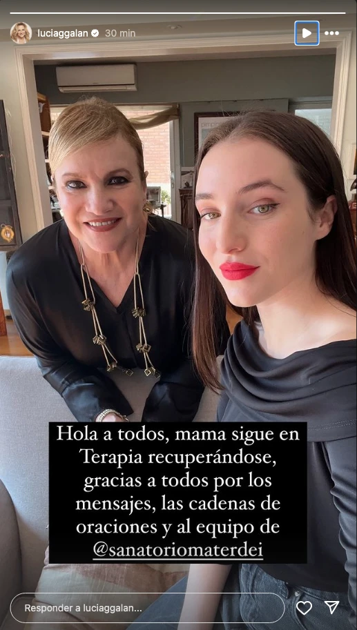 "Hola a todos, mamá sigue en terapia recuperándose. Gracias a todos por los mensajes, las cadenas de oraciones y al equipo del Sanatorio Mater Dei", escribió la hija de Lucía Galán mediante sus redes sociales junto a una foto con la cantante.