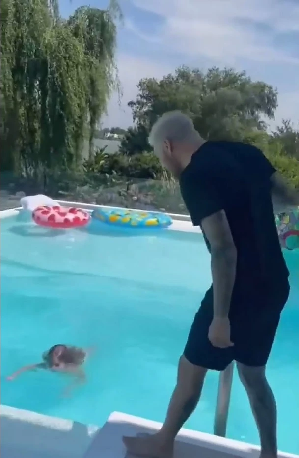 En otro posteo que realizó la blonda, se ve a Mauro sacándose la remera que llevaba puesta y que se acerca a donde está su hija para levantarla de nuevo y tirarse con ella juntos a la piscina. Lejos de relajarse, ella siguió con cara de enojada y lágrimas en sus ojos.