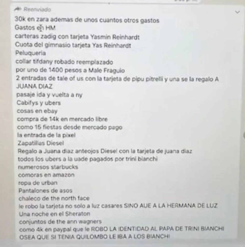 Lo que también apareció y generó una avalancha de reacciones fue la increíble lista de compras y diversos gastos que efectuó "Lola M" en el timo a sus íntimas. Hay para todos los gustos y de todas las formas y colores. Incluso hay situaciones difíciles de clasificar, como un regalo que la chica le hizo a una amiga comprado con la tarjeta de esa misma chica. Increíble, pero real.