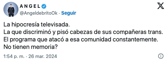 La entrevistada también desmintió que haya existido una enemistad entre Flor de la V y Miró. Sin embargo, Ángel de Brito no estuvo de acuerdo con esto. “La hipocresía televisada. La que discriminó y pisó cabezas de sus compañeras trans. El programa que atacó a esa comunidad constantemente. ¿No tienen memoria?”, escribió en sus redes.