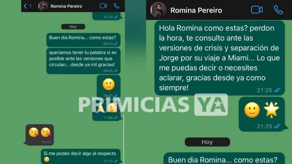 En todo este contexto apareció la palabra de Romina. Sí, la nutricionista se explayó de las versiones de una ruptura conclusiva. El sitio PrimiciasYa la contactó por WhatsApp y ahí se produjo una reacción impresionante. En primera instancia, la morocha cambió la foto de perfil, que era una imagen al lado de Jorge, por una postal de ella sola.