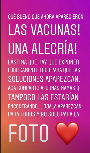 “El laboratorio no entrega', ¿cuál es el laboratorio? ¿Por qué no entrega una vacuna que tiene demanda y es requerida para todos los bebés? ¿Un solo laboratorio entrega? ¿Quién le exige a ese laboratorio que cumpla? ¿Especulan con el dólar? Pregunto porque no sé y quiero entender por qué en un país normal no puedo vacunar a mi hijo en tiempo y forma", escribió visiblemente enojada.