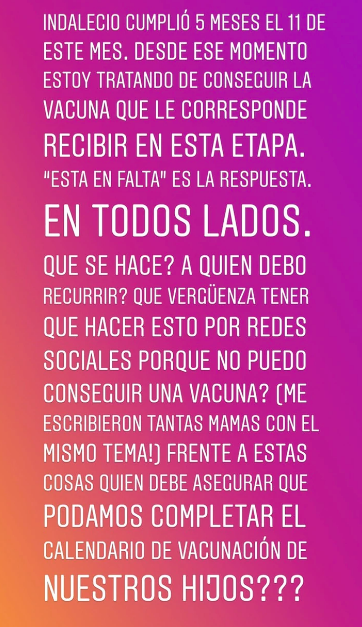 “Indalecio cumplió 5 meses el 11 de este mes. Desde ese momento, estoy tratando de conseguir la vacuna que corresponde a esta etapa. 'Está en falta' es la respuesta. En todos lados" comenzó diciendo