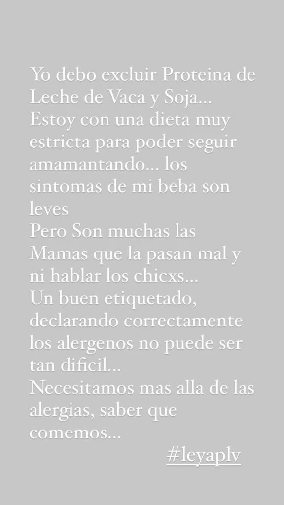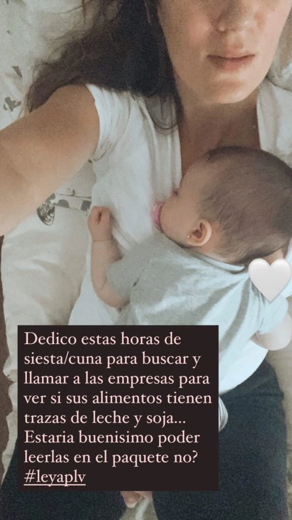 "Yo debo excluir la proteína de la leche de vaca y soja. Estoy con una dieta muy estricta para poder seguir amamantando... Los síntomas de mi beba son leves pero son muchas las mamás que la pasan mal y ni hablar de los chicos", explicó en sus historias de Instagram.