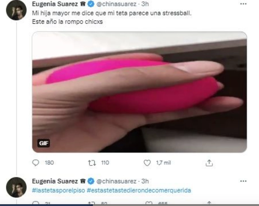 Resulta que la pequeña le expresó un extraño comentario sobre sus lolas, sí, sobre sus lolas. La China escribió en su posteo: “Mi hija mayor me dice que mi teta parece una stressball (bola antiestrés). Este año la rompo chicas".