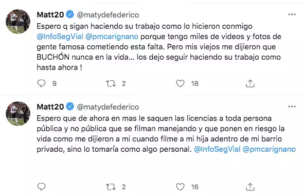 "Espero que de ahora en más le saquen las licencias a toda persona pública y no pública que se filman manejando y que ponen en riesgo la vida como me dijeron a mí, cuando filmé a mi hija adentro de mi barrio privado. Sino lo tomaría como algo personal”, escribió el exfutbolista.