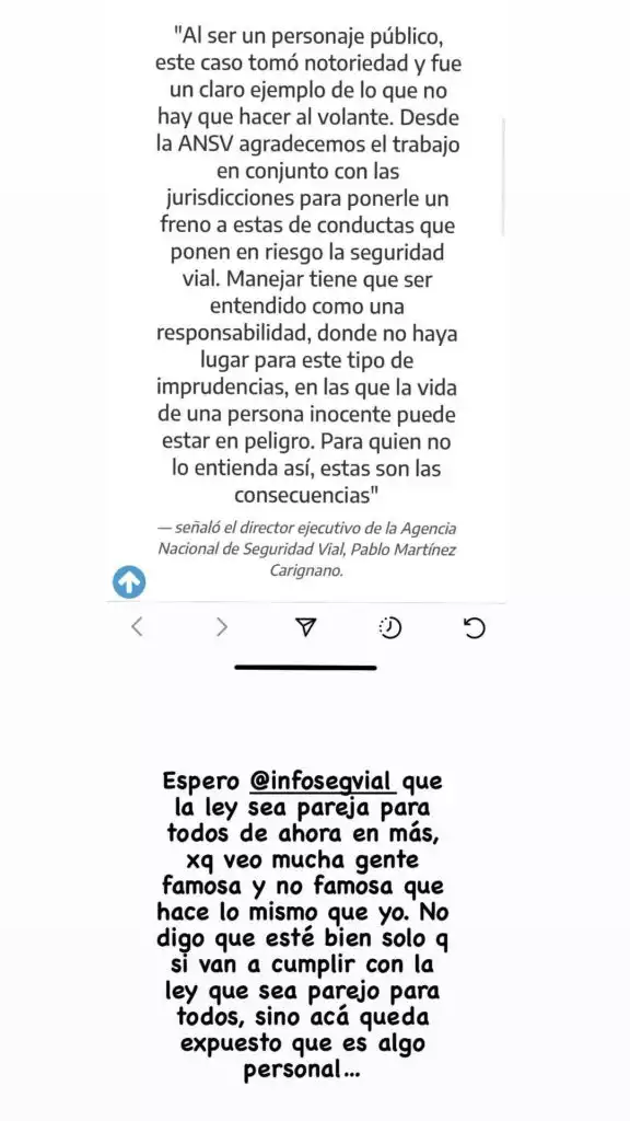 No obstante, el cruce de palabras no quedó en el tintero y fue el propio Director Ejecutivo quien le respondió a sus quejas: "Al ser un personaje público, este caso tomó notoriedad y fue un claro ejemplo de lo que no hay que hacer al volante”.