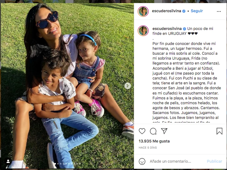 Además del material audiovisual, Escudero armó un texto en su Instagram para detallar el paso a paso de esta experiencia movilizadora en lo emocional. “Por fin pude conocer dónde vive mi hermana, un lugar hermoso. Fui a buscar a mis sobris al cole. Conocí a mi sobrina uruguaya, Frida (no llegamos a entrar tanto en confianza). Acompañé a Beni a jugar al fútbol, jugué con él (me paseó por toda la cancha)", publicó Silvina.