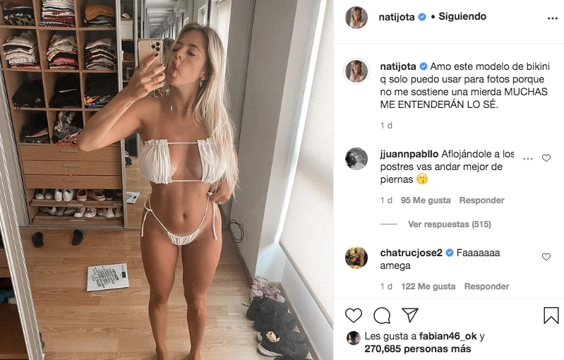Con ansias de lucir un traje de baño de dos piezas en color blanco, Nati posteó una imagen frente a un espejo donde luce cuerpo entero aunque, contó, por escrito que solo iba a usar el modelo para la foto porque no le “sostiene nada”.