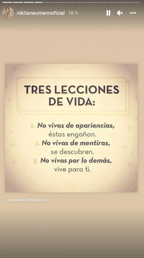 "No vivas de las apariencias, estas engañan; no vivas de mentiras, se descubren; no vivas por los demás, viví para vos", fue la frase que Nicole Neumann decidió postear en sus stories de Instagram donde no etiquetó a Cubero pero dejó en claro que podría aplicar fácilmente.